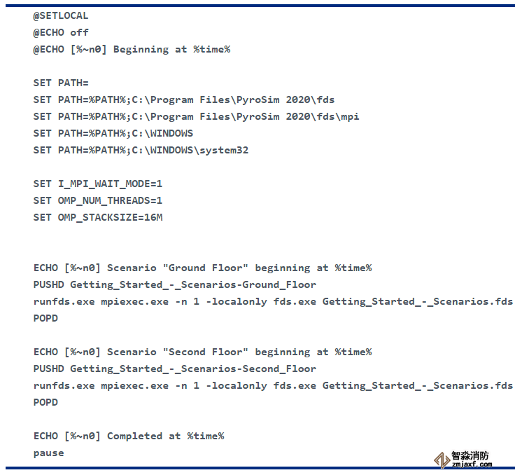 這個批處理腳本將運行 PyroSim 剛剛生成和保存的所有場景。單個 FDS 和其他配置文件位于與批處理文件相同目錄中的文件夾內。