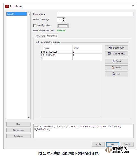 在PyroSim中,附加字段表被添加到網(wǎng)格編輯對話框的選項卡中,這一新功能允許您額外的MPI和OpenMP參數(shù)添加到PyroSim中的每個MESH行,而不需手動導(dǎo)出和編輯文件從命令行運行。http://pg.xfjcyq.com/