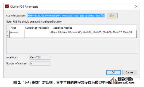 PyroSim中的Run FDSParallel選項將自動設(shè)置MPI進程數(shù)等于模型中的網(wǎng)格數(shù)。要在PyroSim中使用MPI_PROCESS功能,您需要控制啟動模擬的MPI進程總數(shù)。這通過使用Run FDS Cluster選項而不是Run FDS Parallel 來完成。在圖 2在下面,您可以看到本地計算機如何使用單個主機名。然后,當(dāng)您在右側(cè)的列表和表下方的字段中看到 8 個網(wǎng)格時,該主機的進程數(shù)設(shè)置為數(shù)字 4。在這種情況下,將啟動 4 個進程,并分配 2 個網(wǎng)格通過MPI_PROCESS參數(shù)添加到附加網(wǎng)格記錄中指定的每個進程。