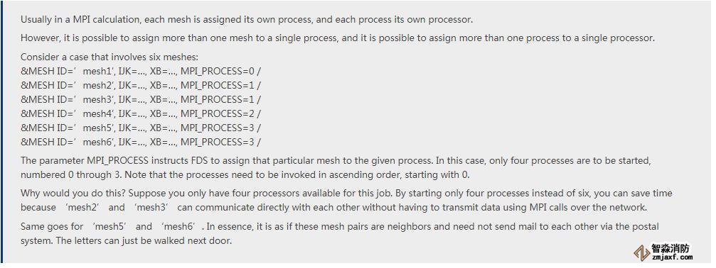 對于使用火災(zāi)動力學(xué)模擬器(FDS)的典型建筑設(shè)計計算,將模擬大量空間。為了描述這個計算體積,整個體積的一個或多個子部分被稱為“網(wǎng)格”,并由輸入文件中的&MESH條目定義。在許多情況下,需要不同分辨率的多個網(wǎng)格來準(zhǔn)確定義模擬的計算域。大多數(shù)現(xiàn)代計算機的每個處理器都有多個“核心”和“線程”,并且通過消息傳遞接口(MPI)功能,F(xiàn)DS允許使用MPI_PROCESS將每個網(wǎng)格分配給給定線程關(guān)鍵詞。此功能允許將任意數(shù)量的網(wǎng)格同時分配同一處理器以提高計算效率。有關(guān)MESH記錄上的MPI_PROCESS和N_THREADS參數(shù)的更多信息,下面引用了該部分相關(guān)的部分以供參考: