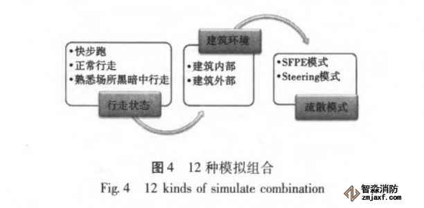 據前所述, pathfinder軟件有兩種疏散模式進行選擇。 現采取其兩種疏散模式即SFPE模式和Steering模式, 對建筑內外的人員進行了模擬, 一共進行了12種組合的模擬, 如圖4所示。
