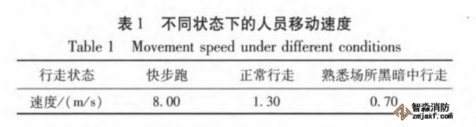 在Pathfinder軟件中設置的人員疏散模擬關鍵參數有人員的移動速度、人員分布情況和疏散模式等等, 這些關鍵參數的設定很大程度上決定了疏散結果。人員移動速度參數的設置人員移動速度是單位時間內人員行走的距離, 人員在不同的狀態下的移動速度是不同的。 根據該化工生產企業的實際情況, 采用三種行走狀態的值來進行模擬。 快步跑這種狀態適用于緊急狀況的快速疏散, 正常行走適用于一般情況下的員工撤離。 使用“熟悉場所黑暗中行走這種狀態” 是因為該工廠的常駐人員是對廠區地形非常熟悉的員工, 并且該化工廠采用“三班倒” 式的生產運作,意味著夜間也有人在生產線的。 各行走狀態的取值如表1所示。