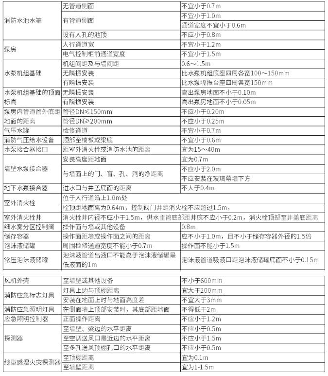 16、消防水池及消防水箱的外壁與建筑本體結(jié)構(gòu)墻面或其他池壁之間的凈距,要滿足施工、裝配和檢修的需要。無(wú)管道的側(cè)面,凈距不宜小于0.7m;有管道的側(cè)面,凈距不宜小于1.0m,且管道外壁與建筑本體墻面之間的通道寬度不宜小于0.6m;設(shè)有人孔的池頂,頂板面與上面建筑本體板底的凈空不應(yīng)小于0.8m。