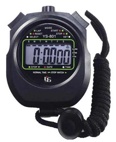 秒表主要有機械秒表和電子表等2類,電子秒表主要為三按鍵和四按鍵2大類。現(xiàn)在,使用最為廣泛的是電子秒表,機械秒表使用已很少見。目前,國產(chǎn)電子秒表一般是利用石英振蕩器的振蕩頻率作為時間基準,采用6位液晶數(shù)字顯示時間,具有顯示直觀、讀取方便、功能多等優(yōu)點,如圖1-1所示。